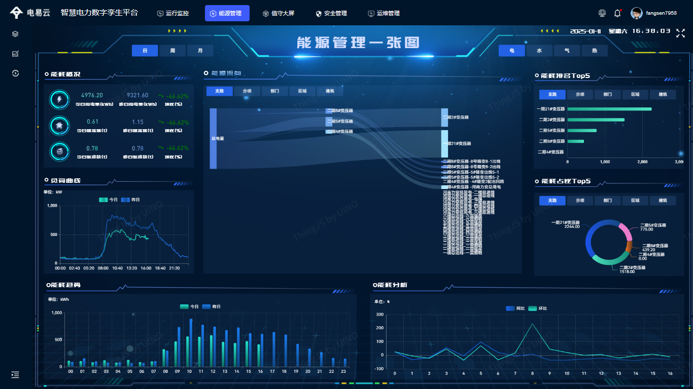 用户可查看用电量、标煤量、碳排放量、人均能耗、单位面积能耗等核心指标,以及能源流向图,清晰呈现各设备、各区域的能耗占比。统计所有用电设备的尖、峰、平、谷时段用电信息,生成负荷曲线,对比今日与昨日负荷变化,辅助调整用电计划。支持将能耗数据导出为表格,便于后续统计分析与报表制作。