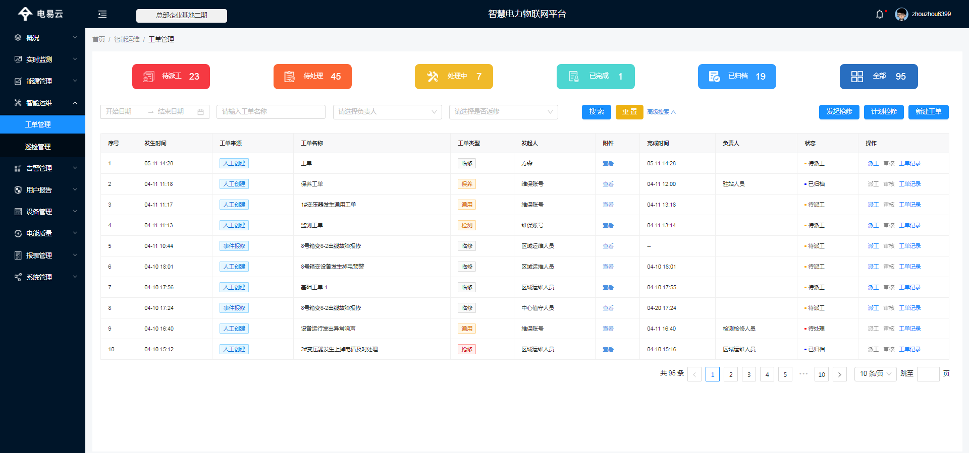 对系统监控过程中产生的事件工单流程进行列表展示和操作。待派工,是指运维人员报修的工单,但还没有执行人员;待处理,是指运维人员已经接单但还没有去执行的一个工单状态;处理中,是指指运维人员接单后已经开始维修但还没有完成的一个工单状态;待审核,是指维修人员已经完成维修,提交后由上级管理人员进行审核;已完成,是指上级管理人员在网页中审核确定后的状态。